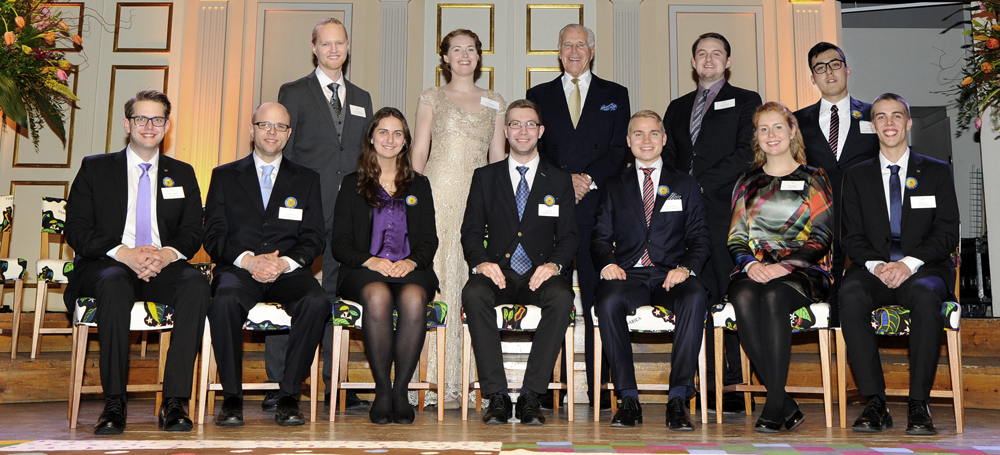 Foto på årets stipendiater. Nedre raden från vänster: Daniel Langkilde (Unga Forskare), Eric Westerberg (Landsbygdsutveckling), Amine Mehmedi (Ung Företagsamhet), Oskars Gauks (Svenska Handelshögskolan i Riga), Rasmus Ritamäki (Svenska Handelshögskolan i Helsingfors), Ellen Nisbeth (Giresta), Philip Frick (Unga Forskare). Övre raden från vänster: Wiktor Sundqvist (Confidencen), Cornelia Beskow (Confidencen), Anders WallTobias Westman (Confidencen) och Mostafa Sharq (Svenska Handelskammaren i Shanghai). På bilden saknas Marika Källman (Svenska Handelskammaren i London). Foto: Cecilia Österberg.