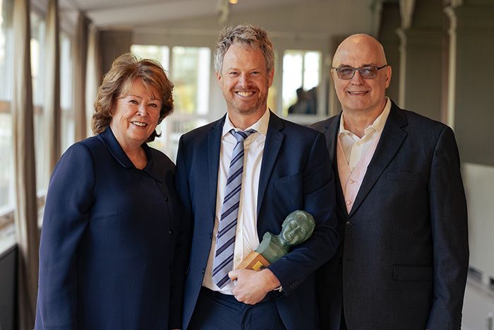 Charlotte Wall, vice ordförande Anders Walls Stiftelse, Joachim Bäckström, 2025 års Jussi Björling-stipendiat, och Gunnar Lundberg, ordförande Stiftelsen Kungliga Teaterns Solister.