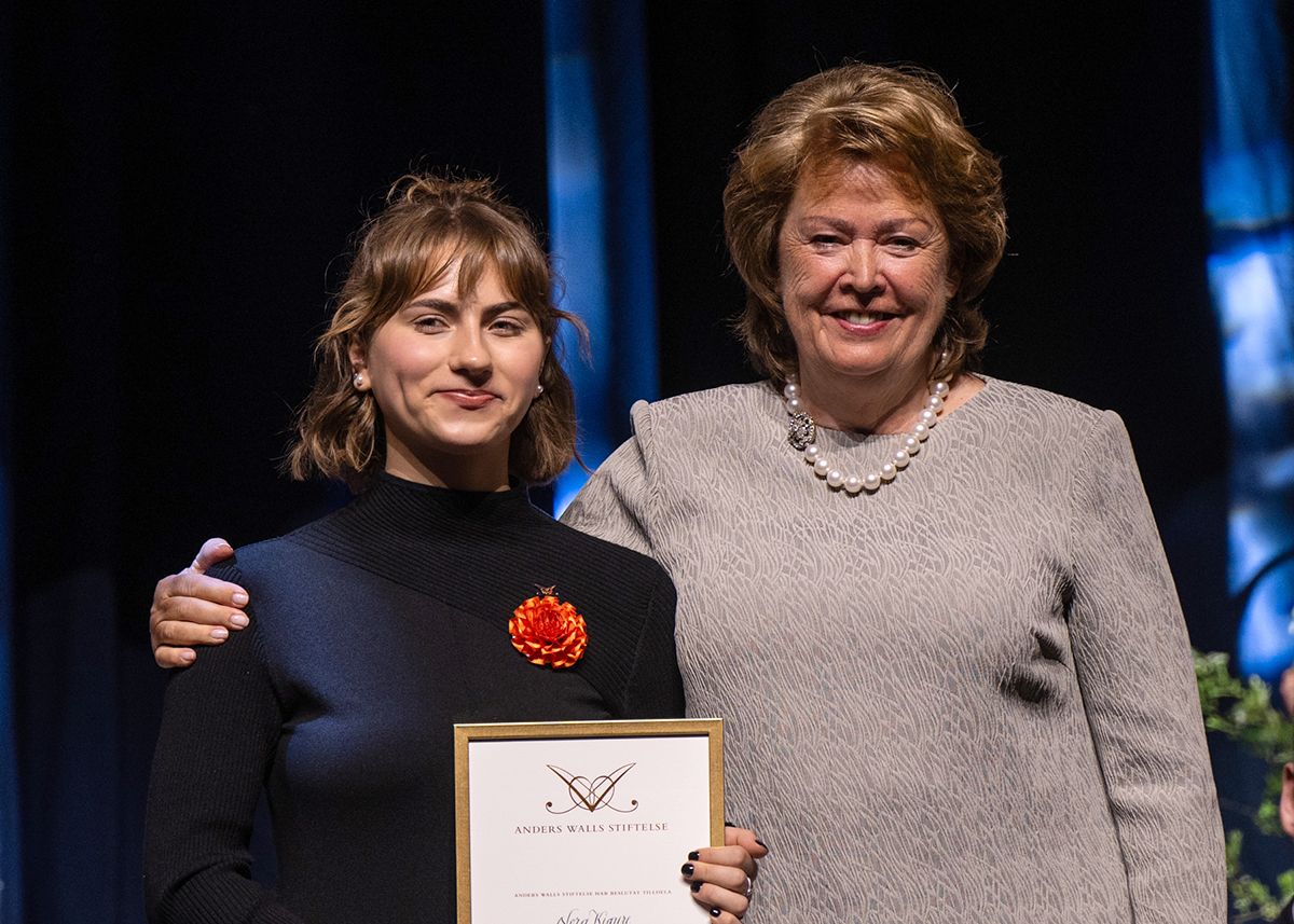Nora Kigure mottar stipendiet av stiftelsens vice ordförande Charlotte Wall.